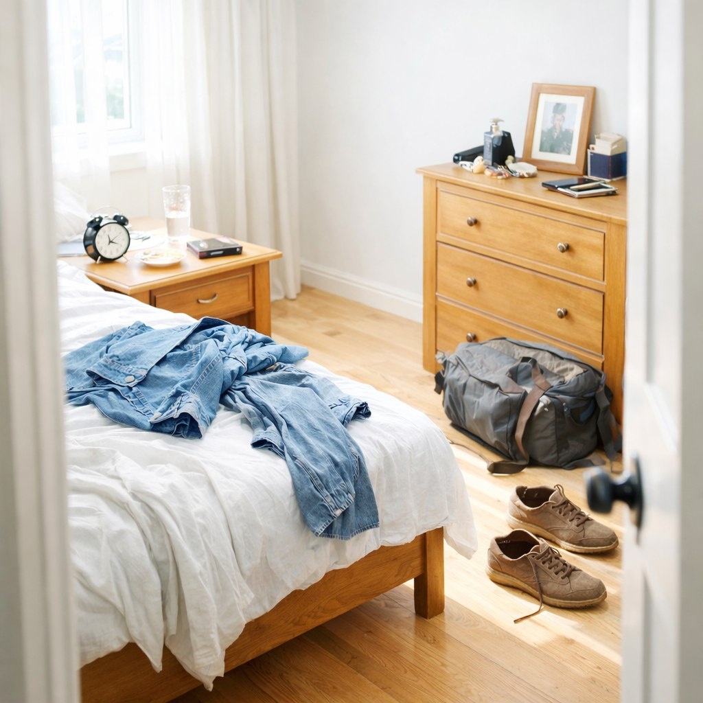 Представьте себе кабинет, где остались вещи человека, который больше не сможет его покинуть. Убегающая одежда, книги и повседневные предметы напоминают о его присутствии...
