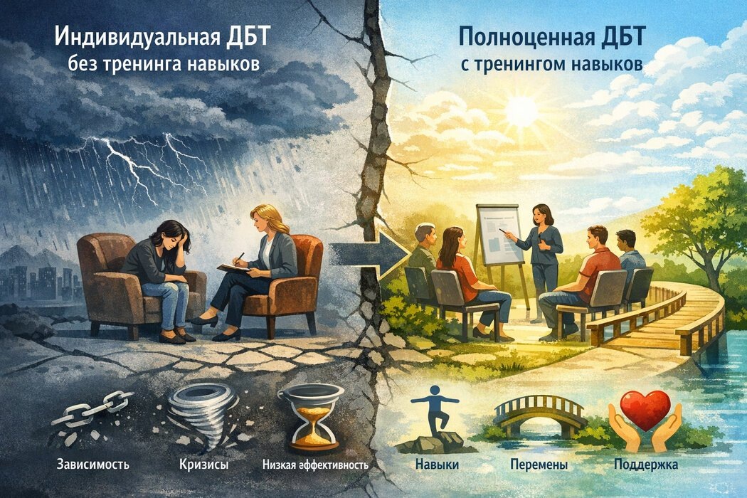 Таким образом, индивидуальная ДБТ без тренинга навыков не может считаться полноценной терапией и должна применяться с осторожностью, чтобы не усугубить существующие проблемы.
