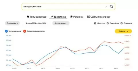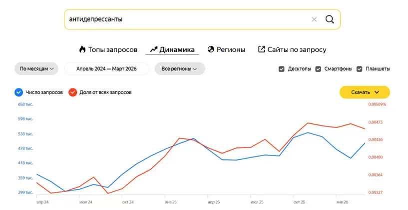 Повышенный интерес к антидепрессантам также подтверждается статистикой поисковых запросов. Если в феврале 2026 года россияне искали информацию о них 447 тысяч раз, то в марте этот показатель вырос до 508 тысяч запросов.