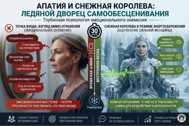 Постепенно человек «замерзает», как персонаж сказки — Снежная Королева. Внутренний мир превращается в безжизненную пустоту, где любые проявления радости считаются недопустимыми. Уходя в невидимость, вы ищете защиту. Ведь проще быть незаметным, чем сталкиваться с критикой своего тела. Это приводит к физическому оцепенению, когда энергии становится всё меньше, а самооценка стремится к нулю.