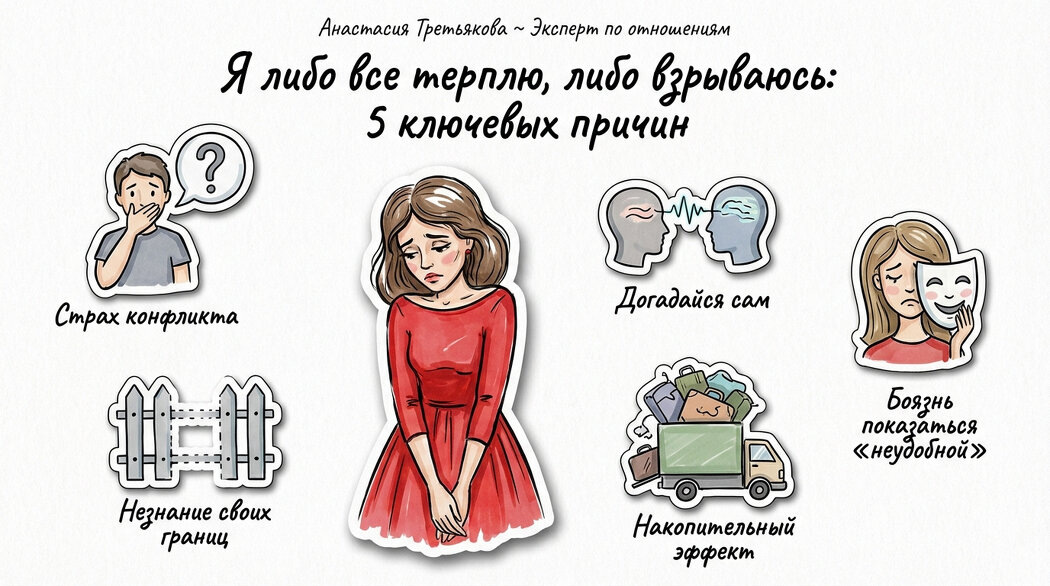 - Страх конфликта: С детства многие усваивают, что конфликт — это что-то ужасное. Из-за этого нередко подавляют свои чувства, считая, что лучше молчать. Примером может служить ситуация с Мариной, которая два года терпела, когда ее муж перебивал ее в разговоре. В итоге срыв случился в магазине, когда терпение иссякло.